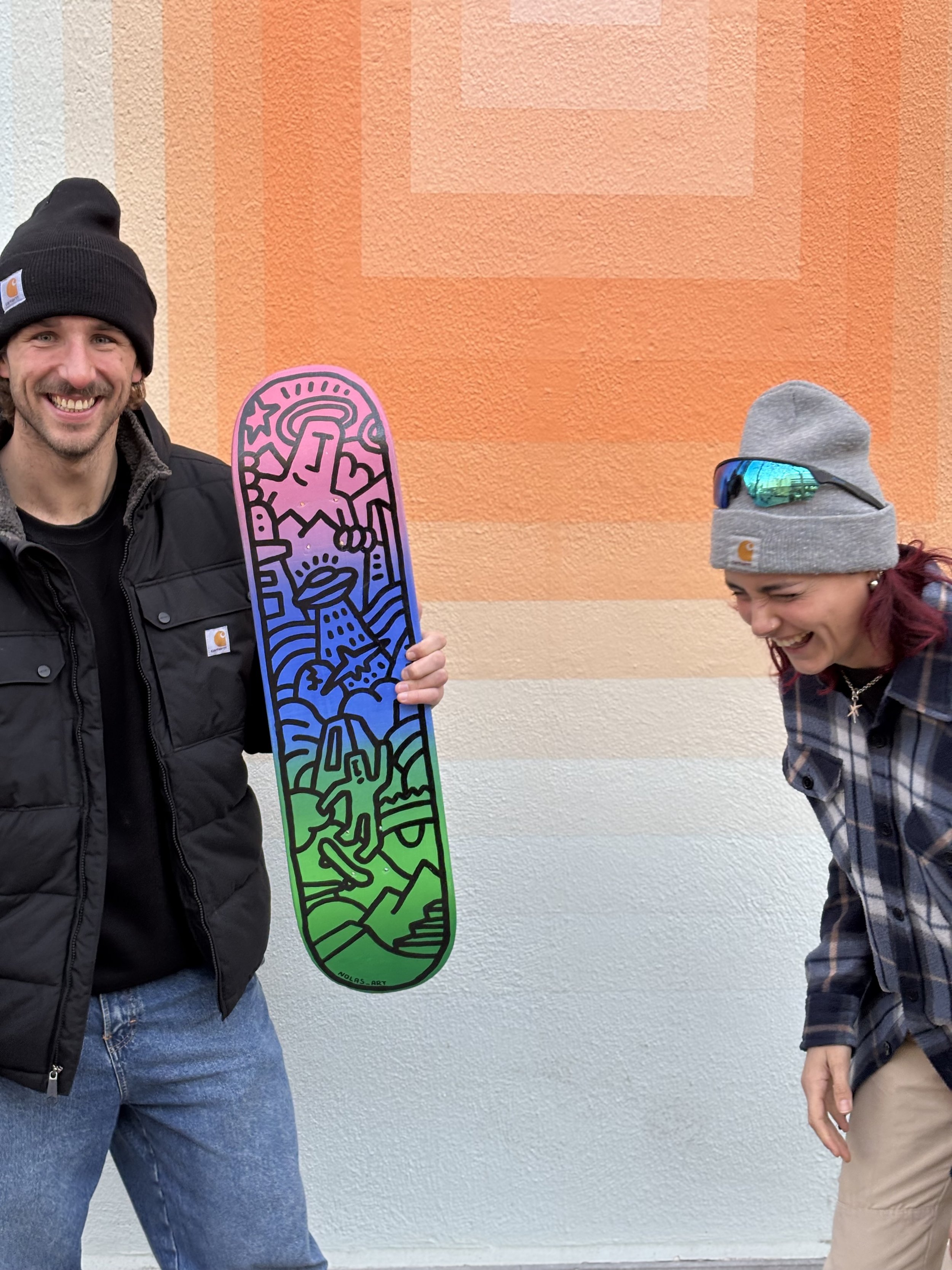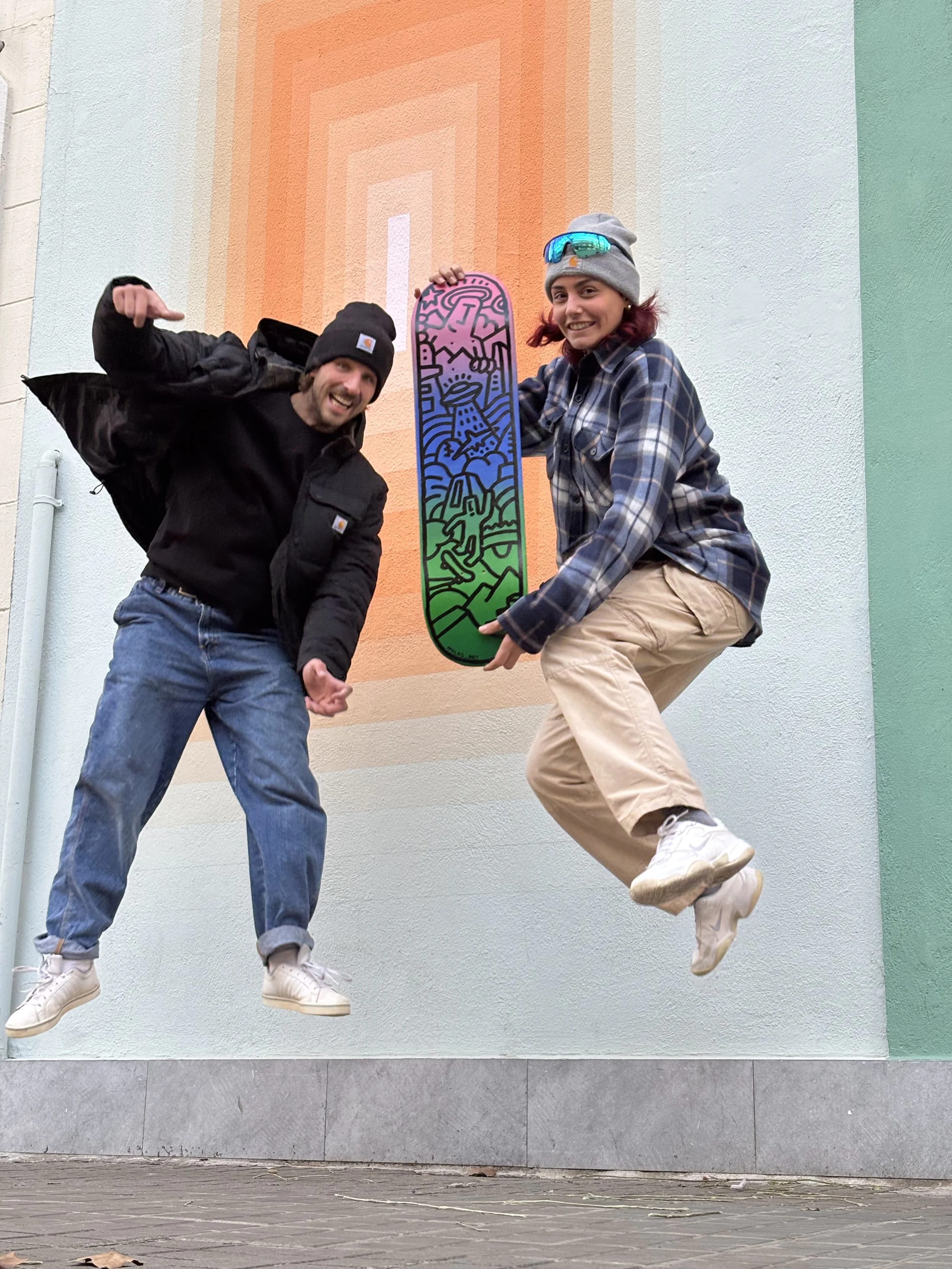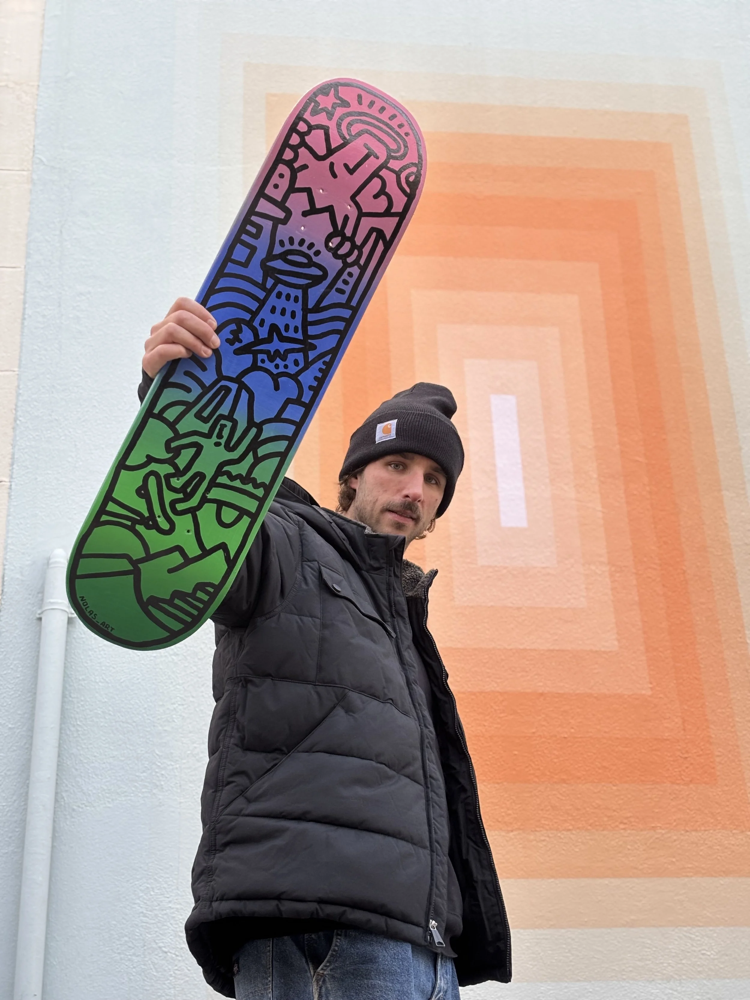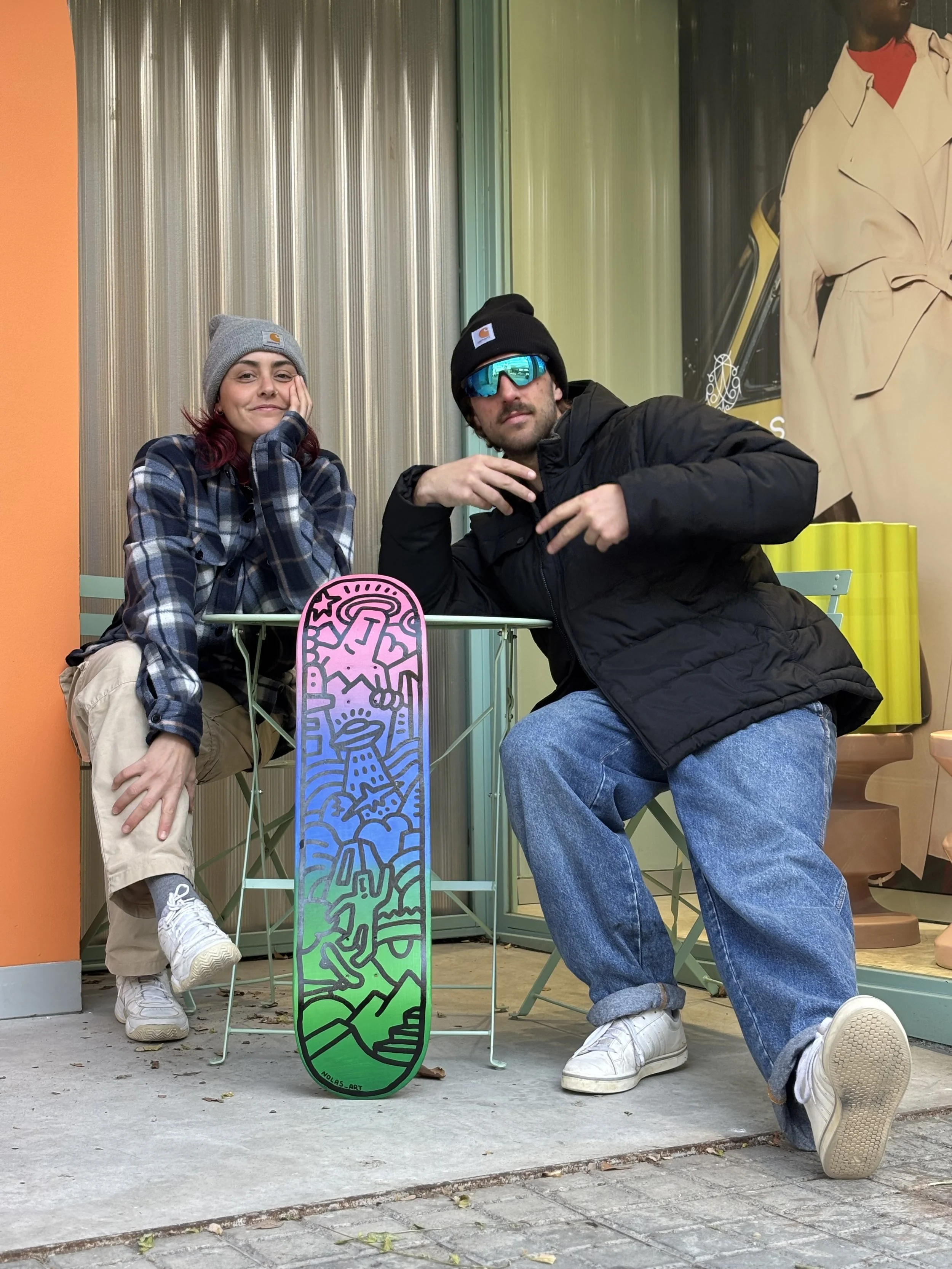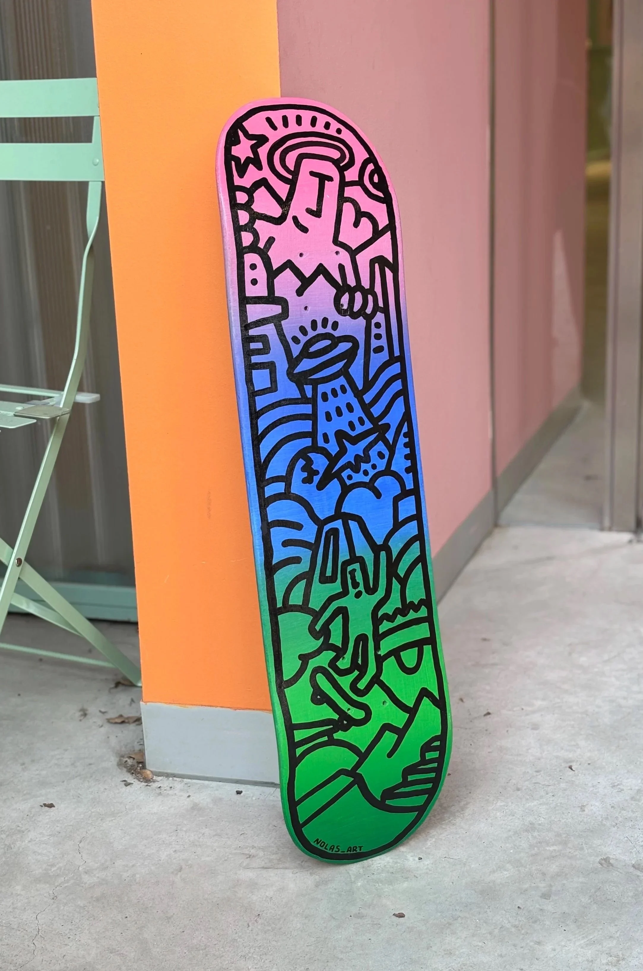 With my friend @nolas_art we created this collab art piece that combines Thilli’s bright colors and Nolas’ street art style on this recycled skateboard. We both share care for circularity and this piece is the fruit of our combined values and art styles (check his page he is a genius when it comes to recycling furniture into art piece). From bottom up, you can find city elements made of concrete inspired by the skate culture, as well as nature elements; and of course the famous Nolas character as god figure linking it all together.
